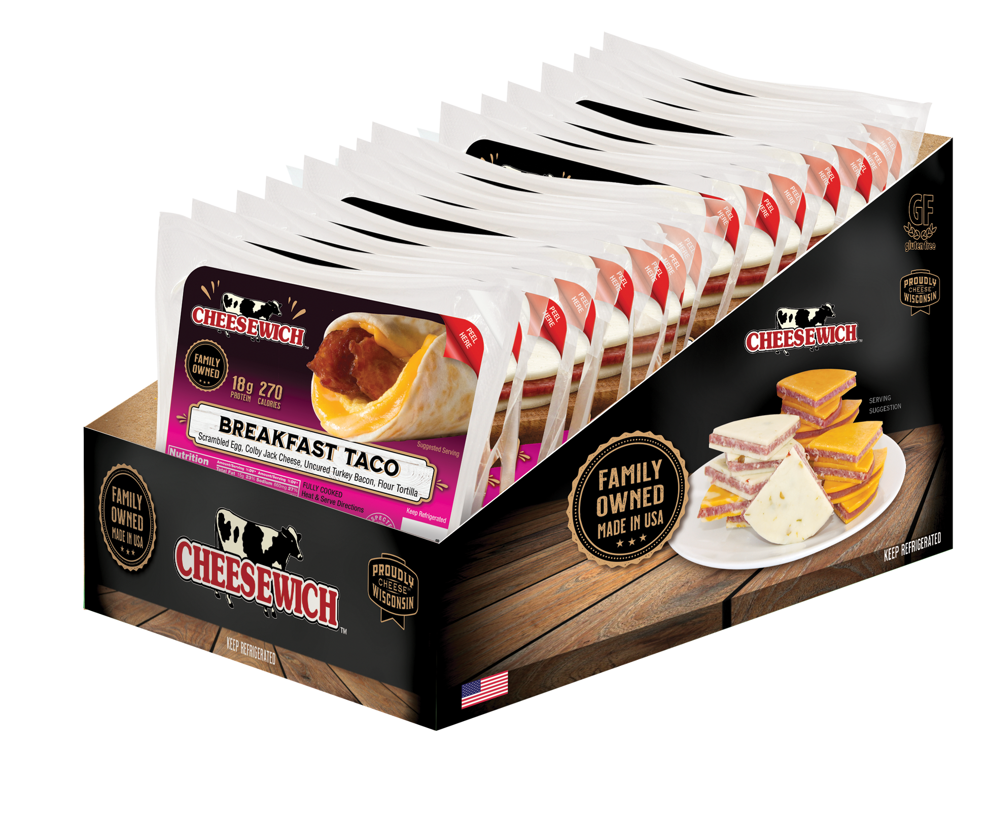 Our Breakfast Taco features three slices of uncured turkey bacon, scrambled eggs, and creamy Colby Jack cheese, all wrapped in one soft flour tortilla. Made with Wisconsin cheese from cows raised without added rbST hormones and all-natural ingredients.